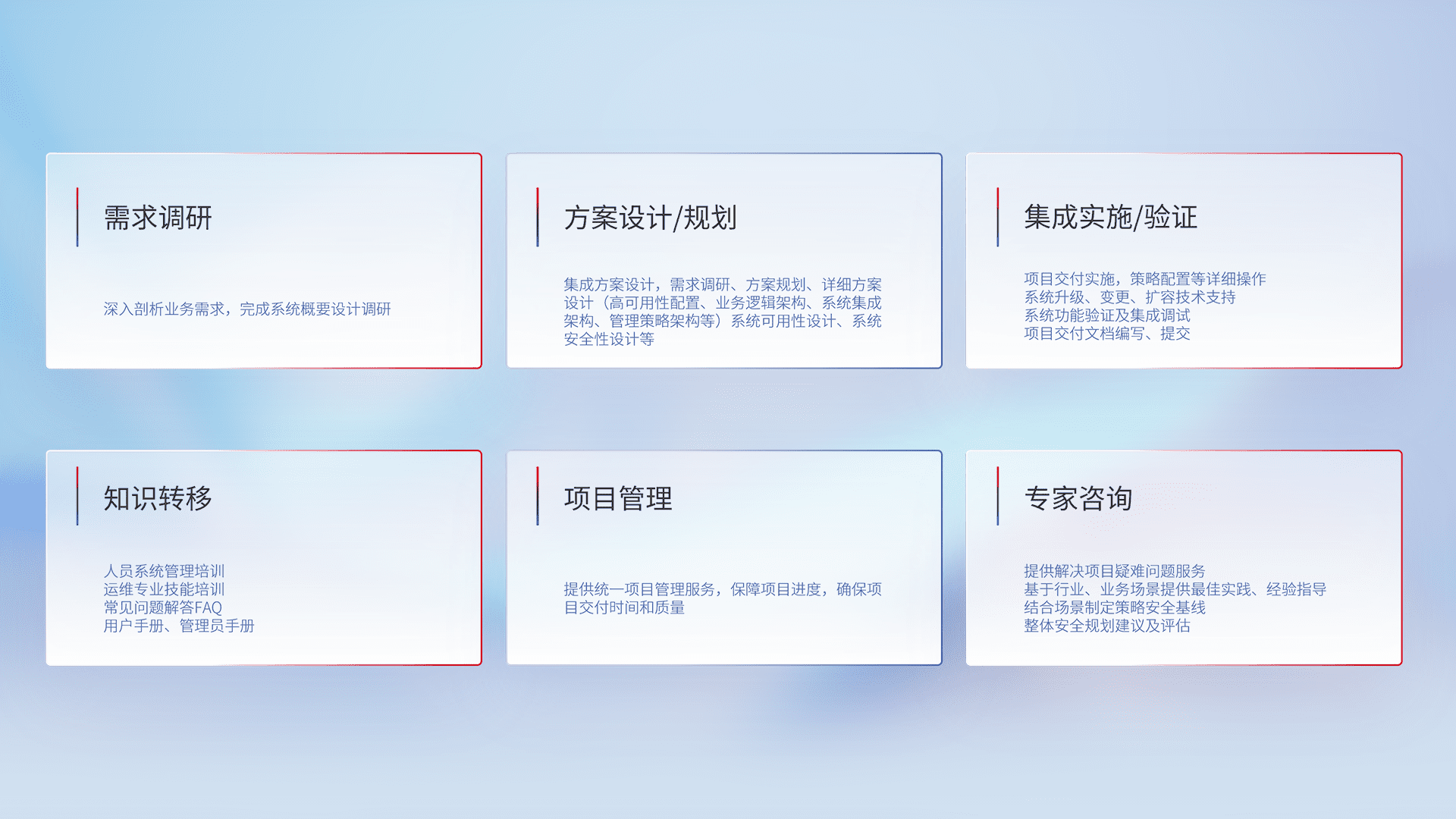 针对客户行业特性,,,,将宏观的安全战略和需求,,,,通过专业的交付服务,,实现项目落地,,,为客户提供标准规范的集成交付服务。。